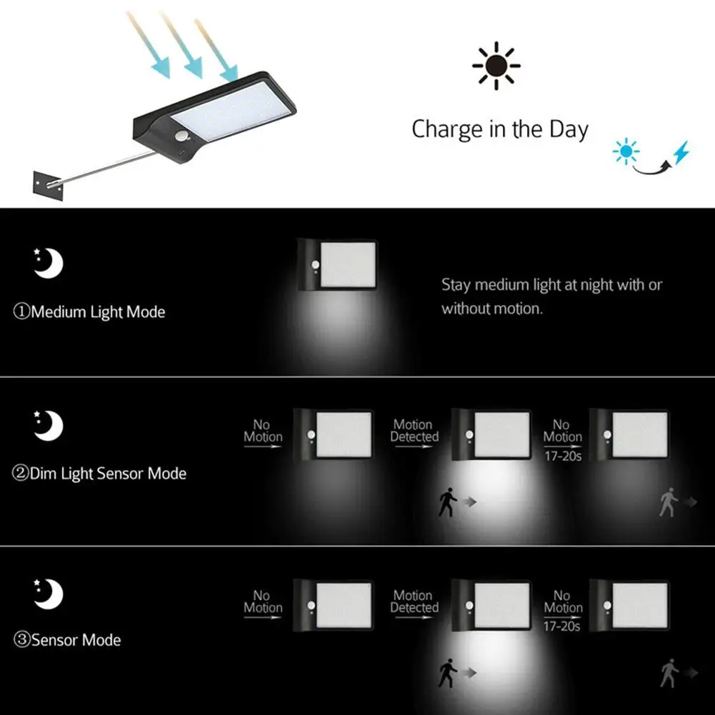Waterproof 48LED Solar Light Human Induction Sensor 3 Modes for Street Wall Lamp Good Transmittance